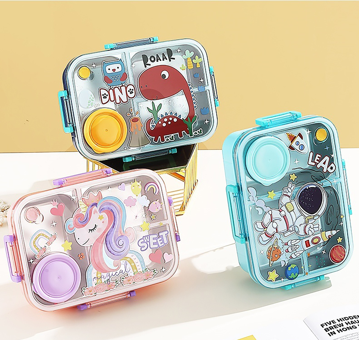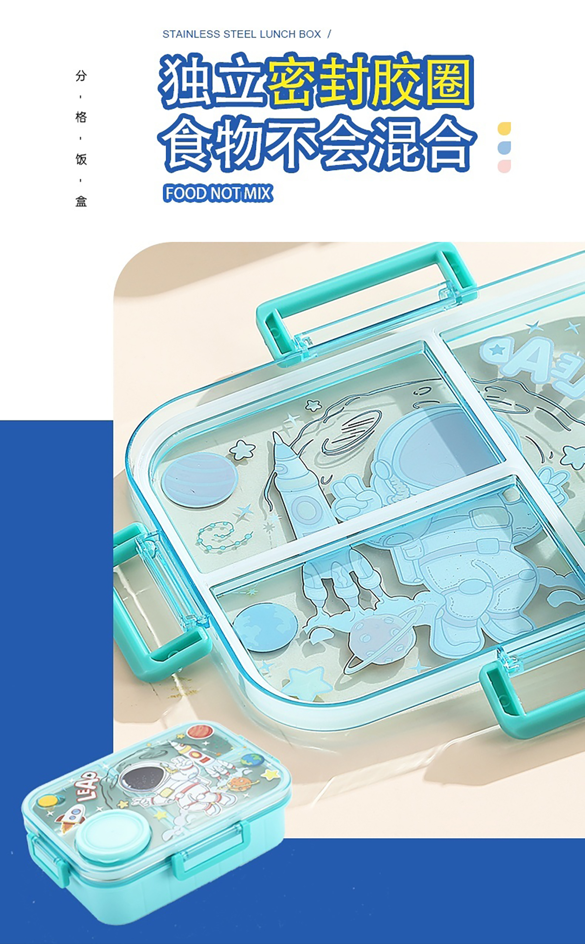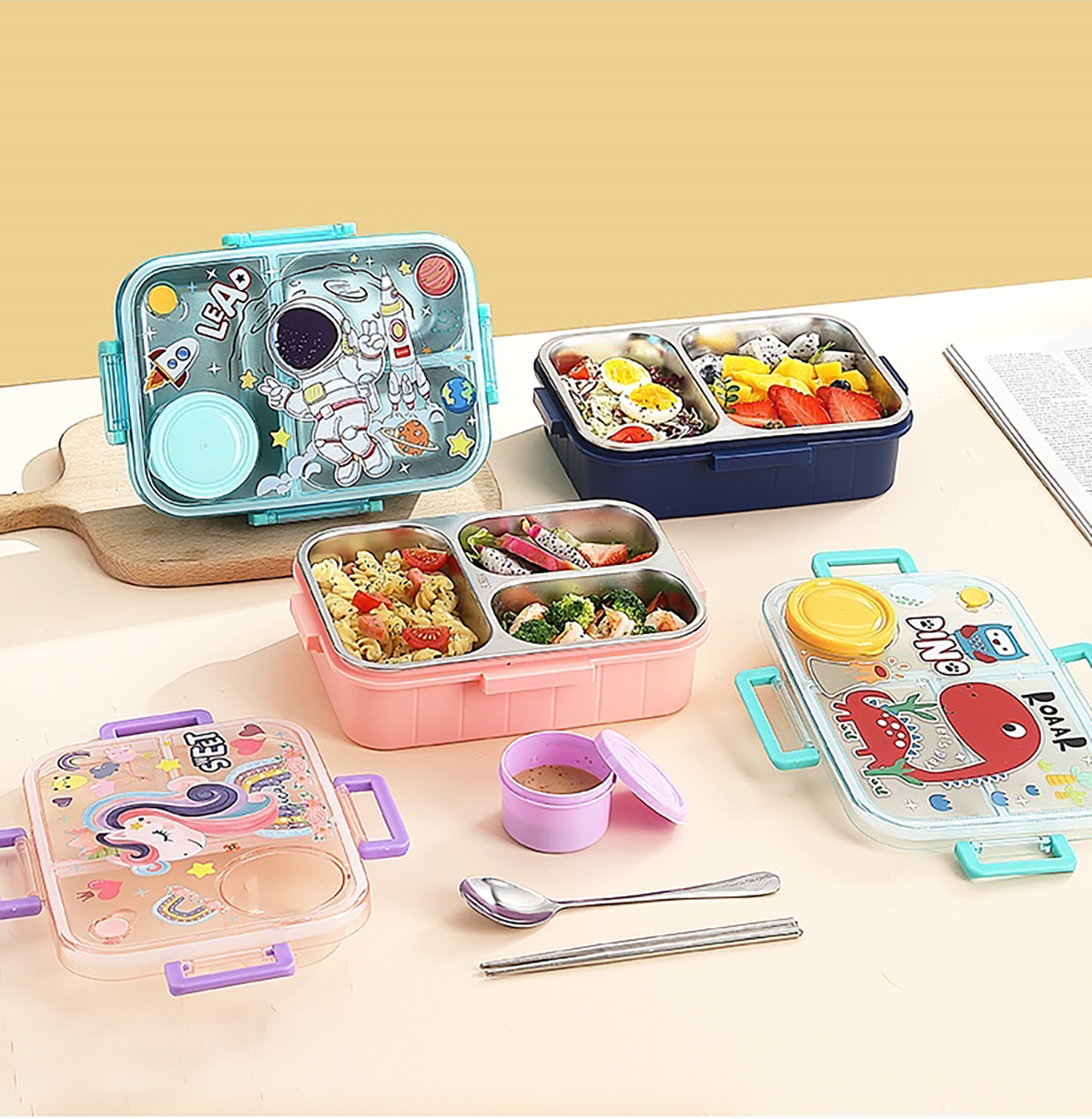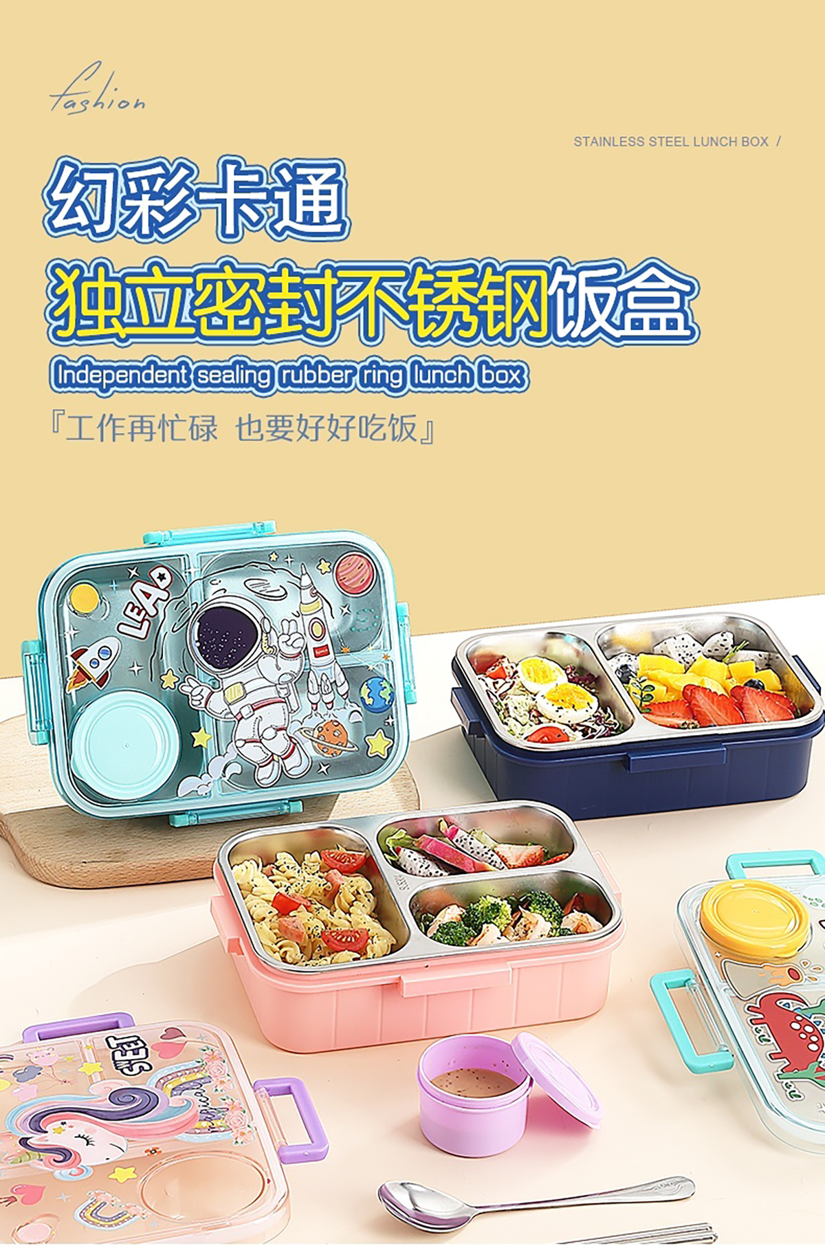 幻彩卡通獨(dú)立密封餐盒(2格800ml/3格750ml配不銹鋼勺筷+PP醬杯80ml)