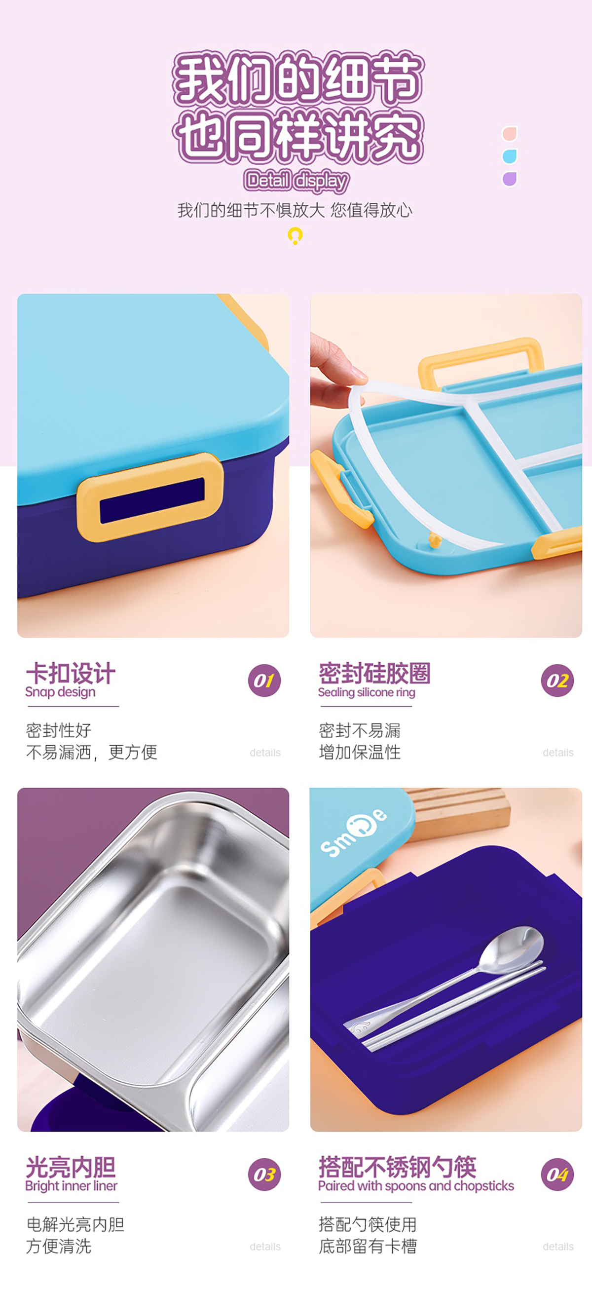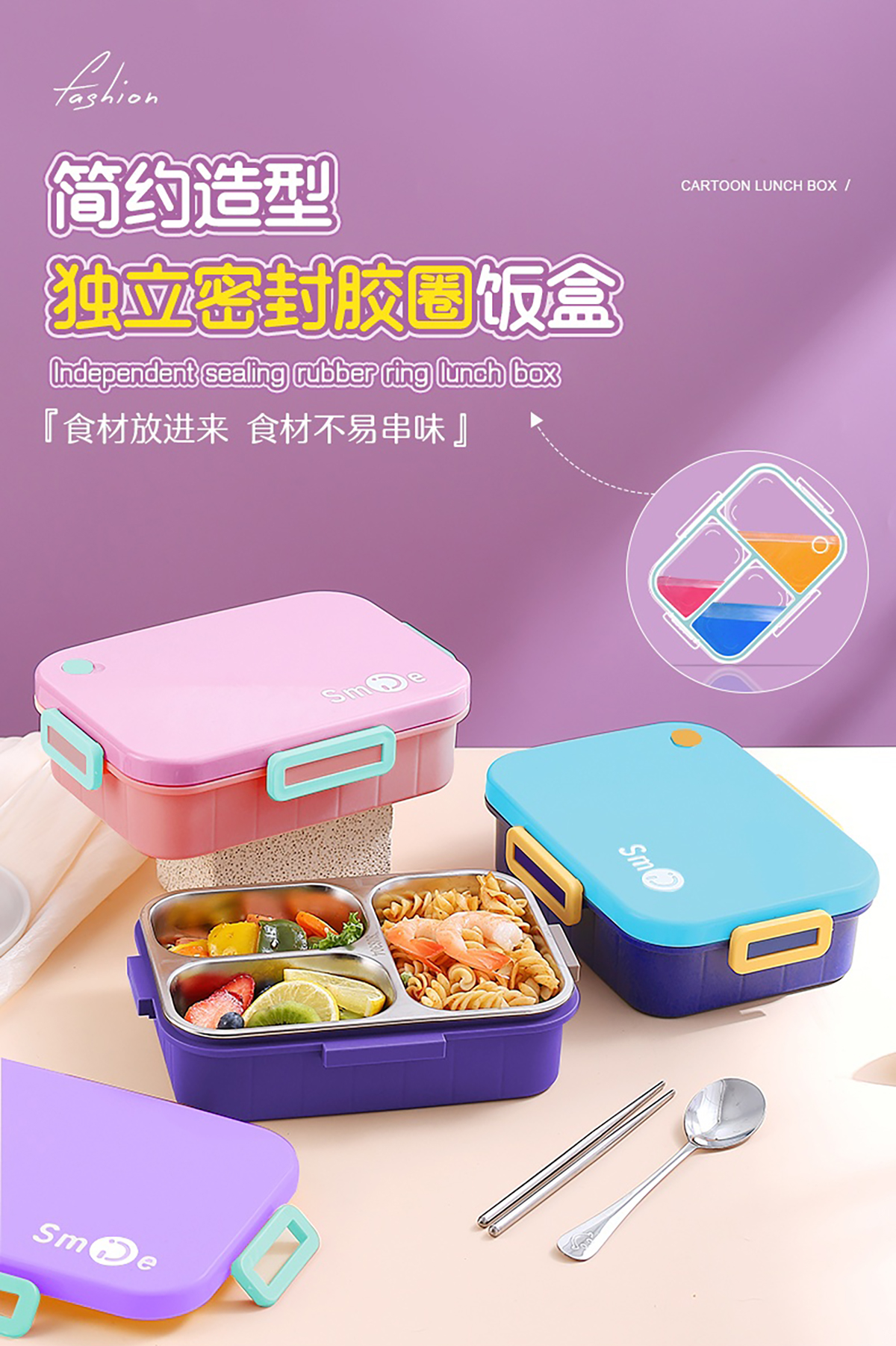 獨(dú)立密封不銹鋼餐盒(時(shí)尚二格800ml/三格750ml+不銹鋼勺筷)