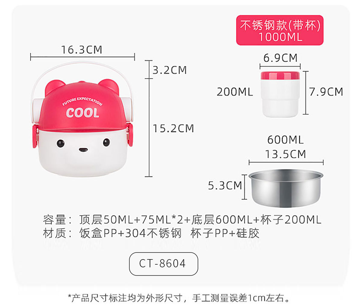 CT-8604(不銹鋼款套裝):160*155*150mm/1000ml 69*79mm/200ml