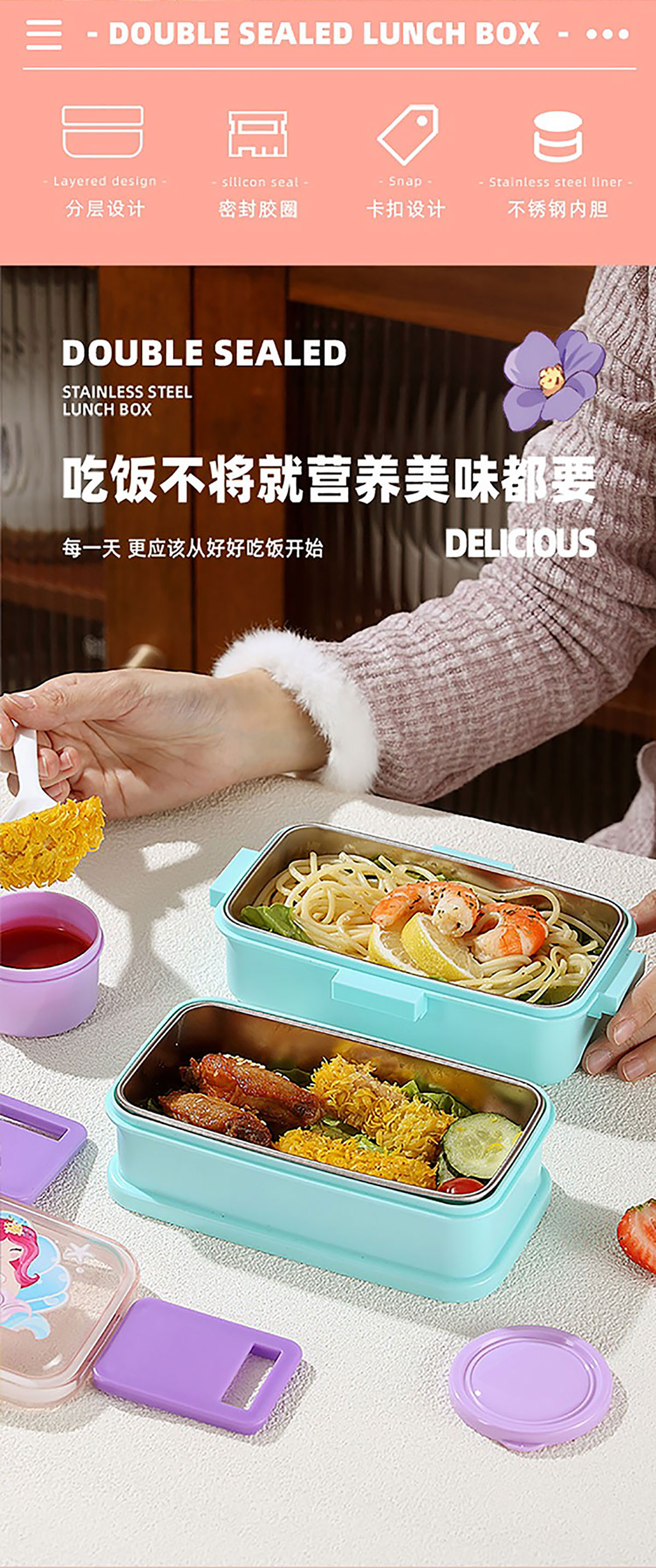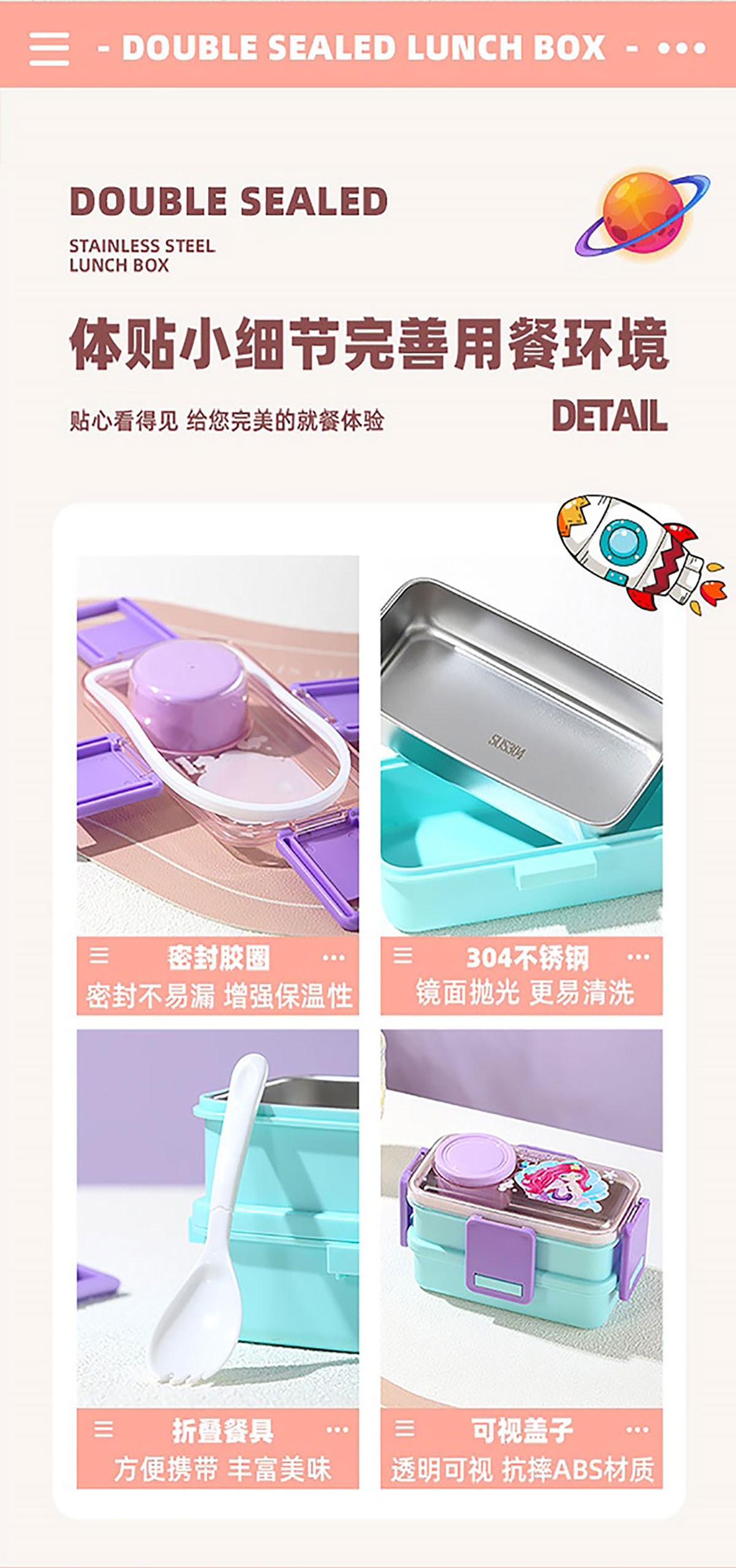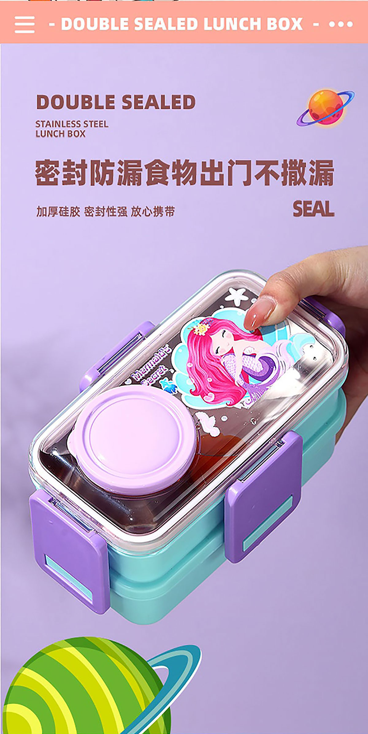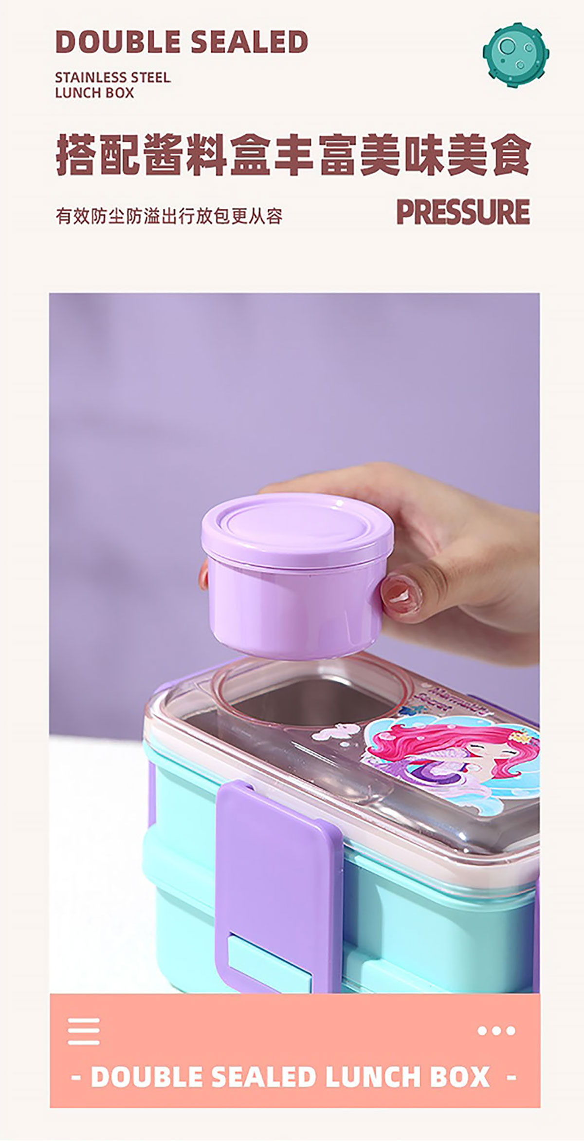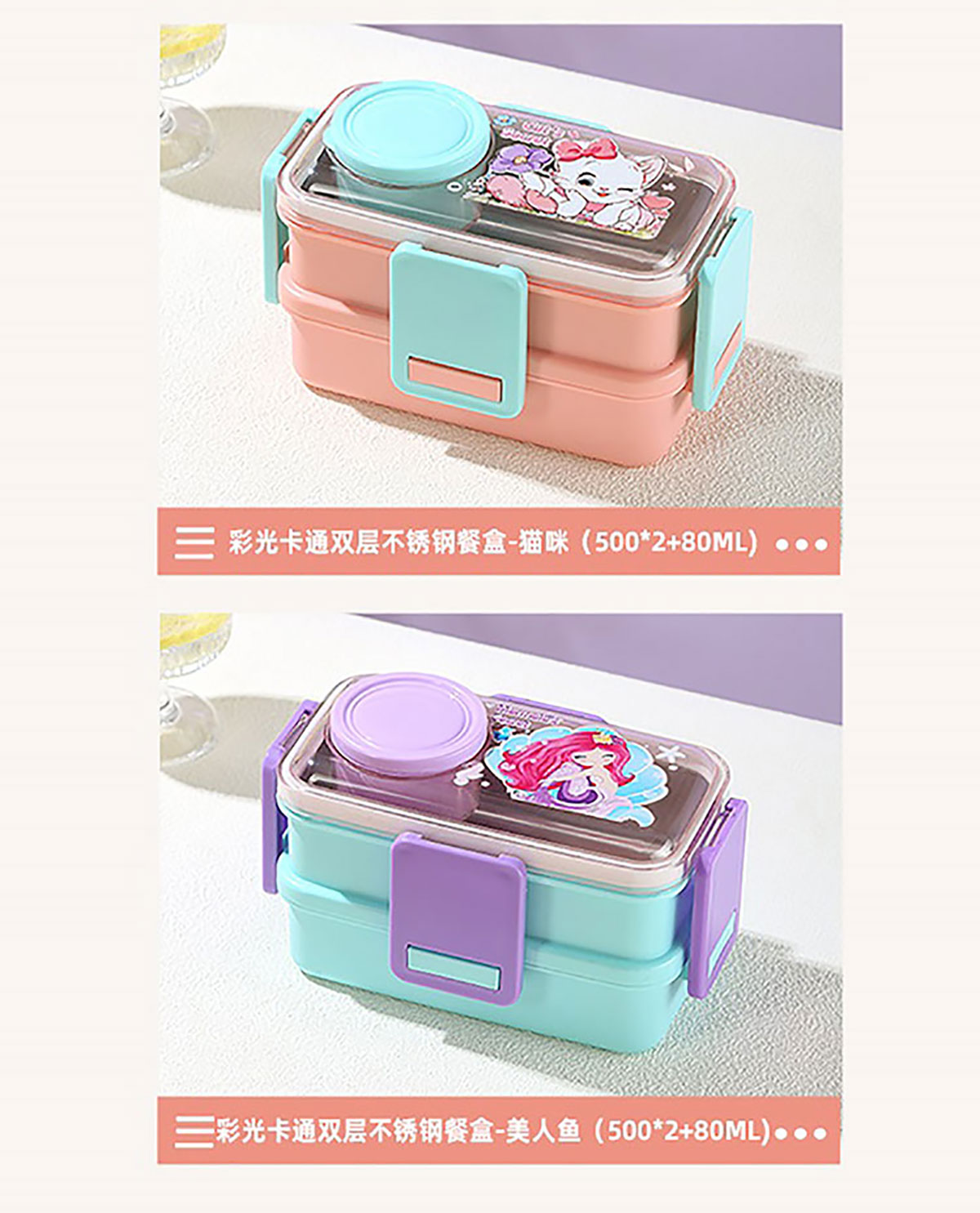 彩光卡通雙層不銹鋼餐盒(500mlx2+外置醬料杯80ml)